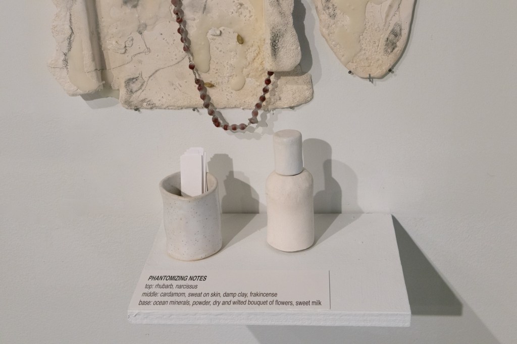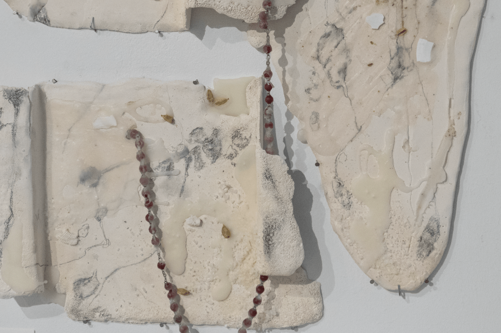 graphite, beeswax, soap, cardamom pods, salt, ash, wooden rosary, and crushed shells on ceramic