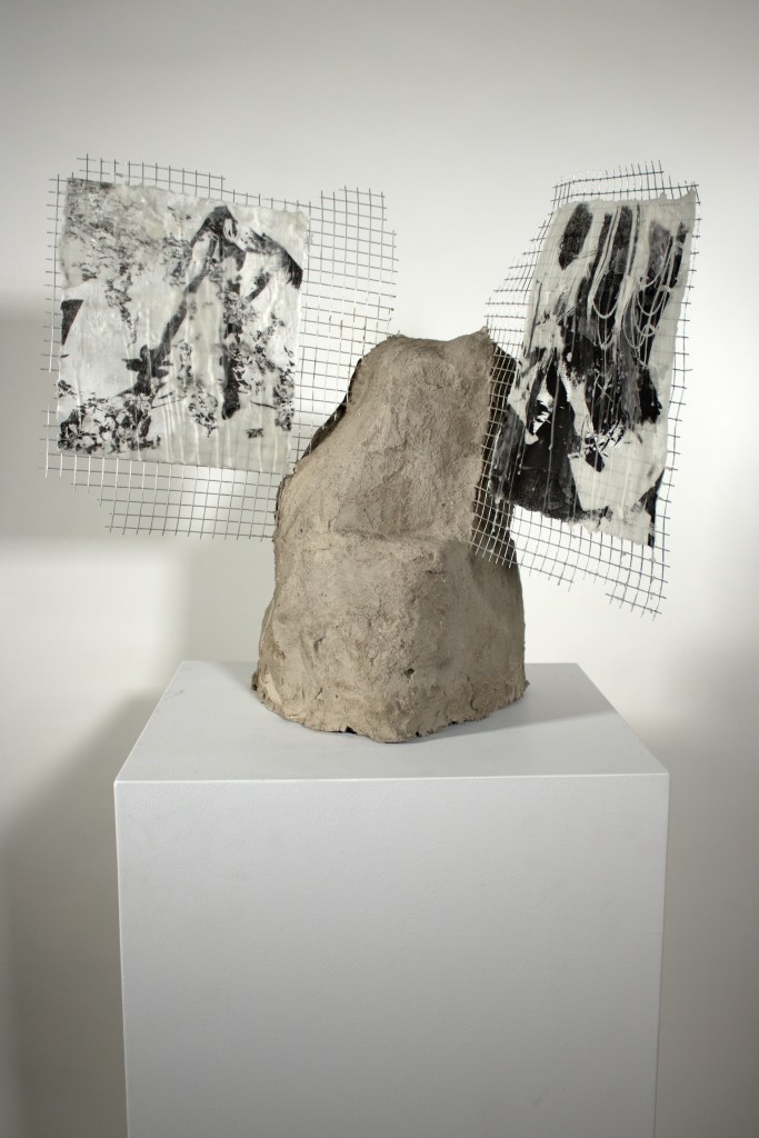 Concrete, Metal wire mesh, beeswax, screenprint on mullbery paper