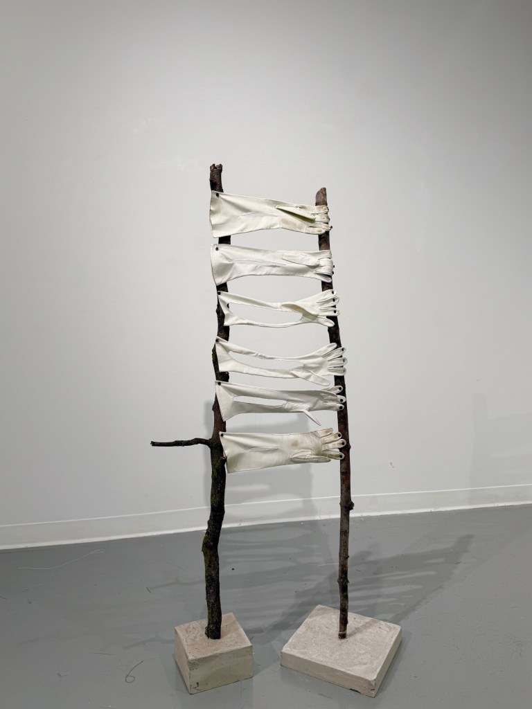 Concrete, Wooden Sticks, Vintage gloves, Thread, Nails